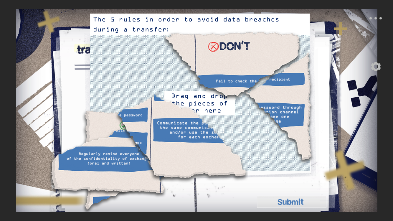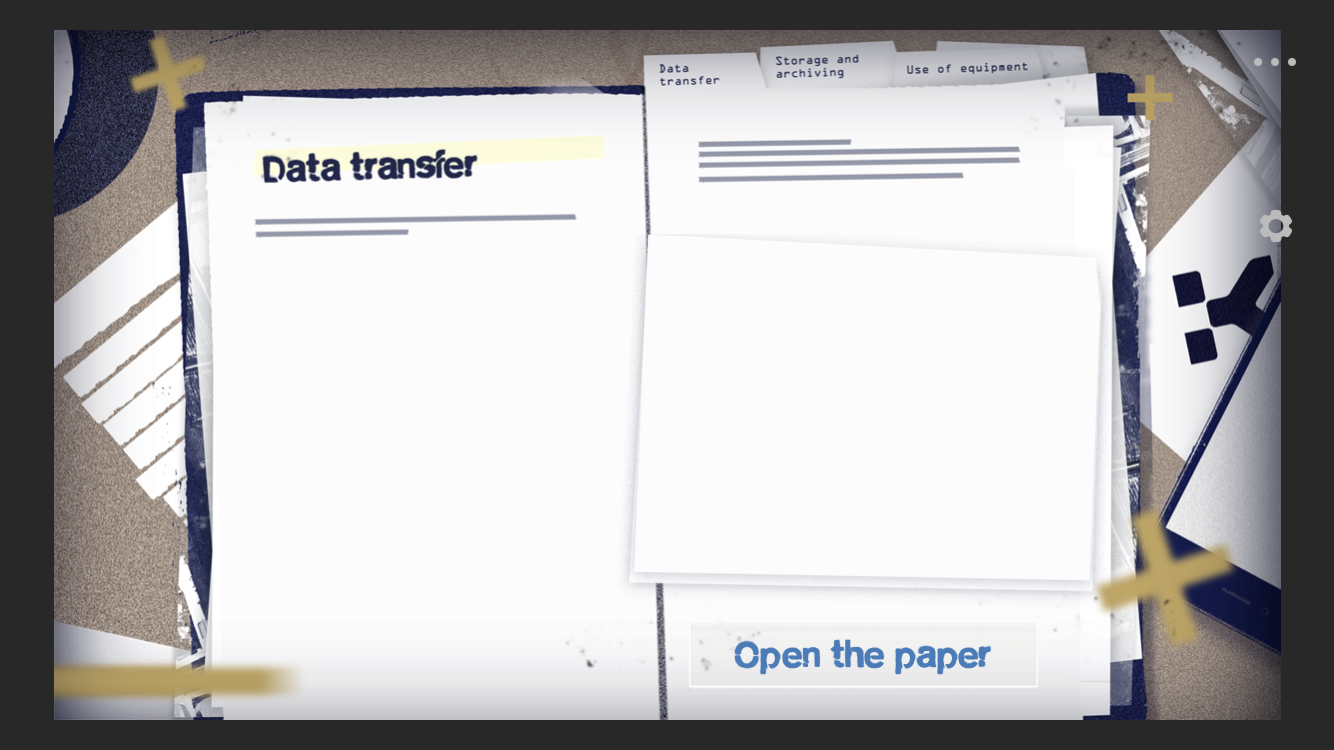Learners start the training, launch the first video and the immersion is immediate. Plunged into darkness, we’re asked to remove the blindfold covering our eyes and we discover the War Room, a secret room dedicated to data protection.