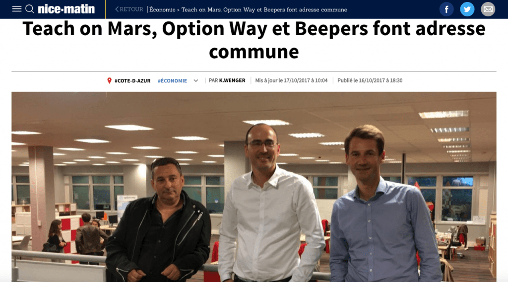 Incubés au @BusinessPole , @socialbeepeers @TeachonMarsfr @OptionWay inaugurent leur siège commun à Sophia Antipolis, avec @JeanLeonetti pic.twitter.com/WK5hj08j7r