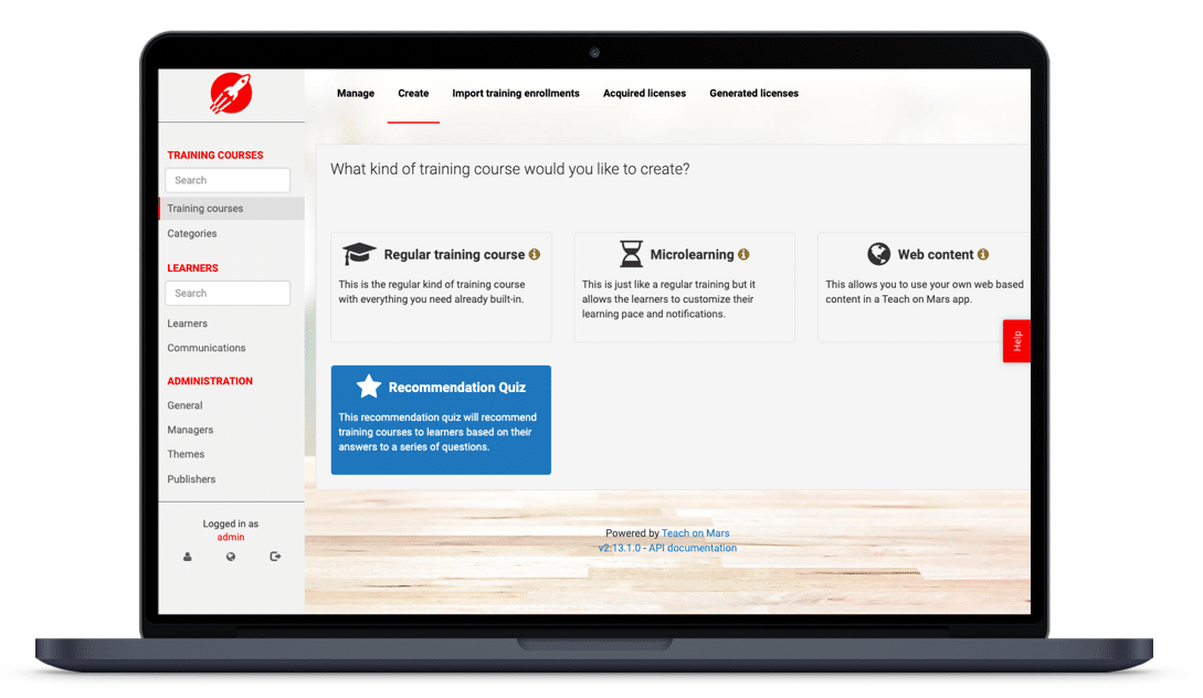 Le quiz de recommandation débarque chez Teach on Mars pour vous permettre de personnaliser l’expérience de vos apprenants et de mieux développer leur potentiel, en leur proposant les contenus qui leur correspondent. Il vous suffit de créer un questionnaire thématique pour vos apprenants. En fonction de leurs réponses, différentes formations leur seront recommandées. Celles-ci apparaîtront dans l’espace « mes formations recommandées » de l’application de l’apprenant, afin que celui-ci les retrouve rapidement.