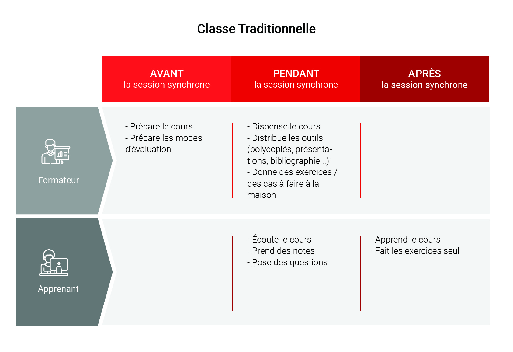 Historiquement le formateur présente les concepts, transmet les notions à savoir durant la session synchrone et laisse les apprenants mettre en pratique une fois qu’ils sont de retour à leur poste de travail.