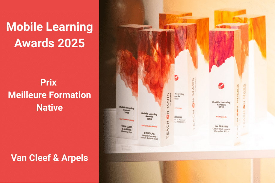 Cette année encore, les Mobile Learning Awards ont célébré l’excellence pédagogique et la créativité dans le domaine du mobile learning. Ce fut notamment le cas du prix formation native, qui récompense la meilleure formation conçue exclusivement avec les activités natives de la solution Teach on Mars. C’est la prestigieuse Maison Van Cleef & Arpels qui s’est imposée en 2025 avec sa formation Blooming Days.